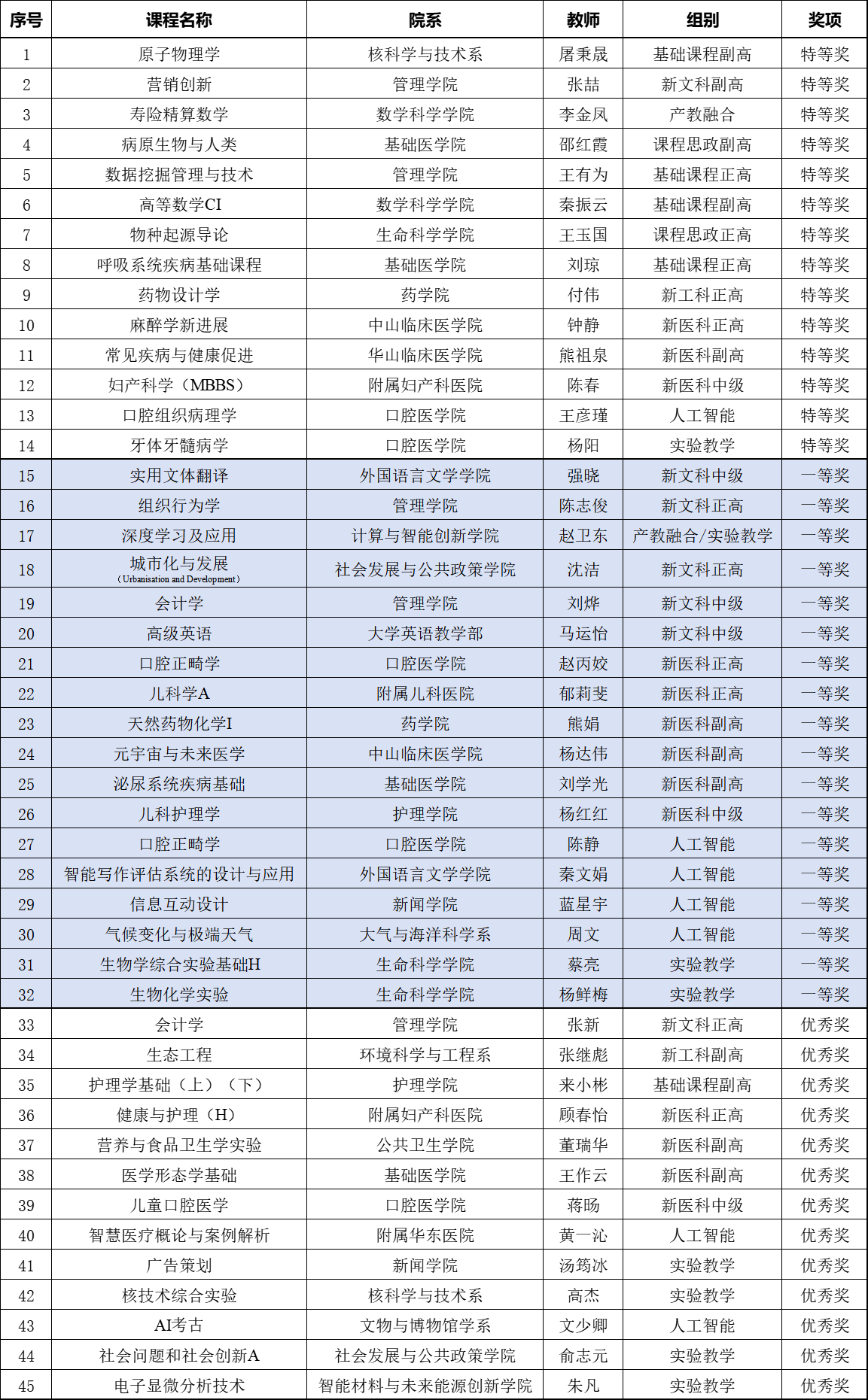 第六届复旦大学教师教学创新大赛于2025年11月启动,2026年3月顺利结束。大赛分初评和复评两阶段,经过综合评定,最终文理医科产生了特等、一等、优秀奖共计45人,获奖名单如下。