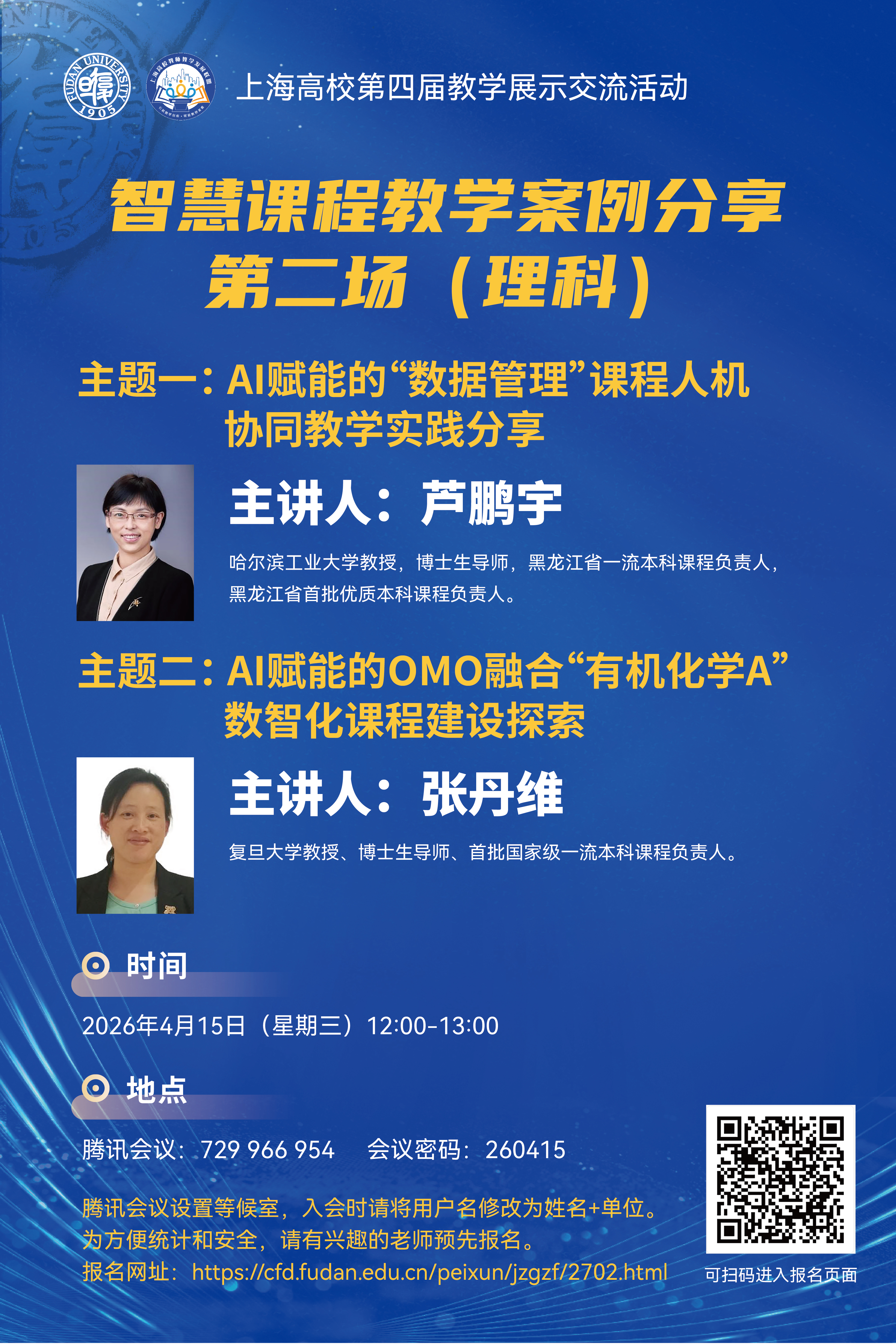主讲人:张丹维,复旦大学教授、博士生导师、首批国家级一流课程负责人。2003年以来讲授化学类本科生“有机化学A I”“有机化学A II”课程,是本研融通“有机化学A”课程负责人,获评复旦大学首批本科优质课程(2023年)和本科教学成果奖一等奖(第一完成人)(2021年)。担任化学“101计划”核心教材《有机化学》和《有机化学动态电子教案》第一主编,是课程建设骨干。作为负责人承担了教育部“基础学科拔尖学生培养计划2.0”研究课题、复旦大学本科教学改革项目等多项教学研究和改革课题。“基于超星泛雅平台AI赋能的‘有机化学A’教学探索”构建了AI赋能的OMO融合数智化课程,成果入选复旦大学人工智能教育教学创新中心平台教学案例。“有机化学A I”和“有机化学A II”被认定为2025年度复旦大学智慧课程。